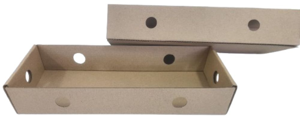 Modelul include tavă de bază și capac cu orificii laterale, pentru aerisire sau manipulare ușoară. Este realizată din carton micro ondul, oferind un echilibru perfect între rigiditate și greutate redusă.